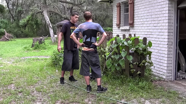 When RB gets caught borrowing tools from the garage Blaze knows he has to assert his position of authority. He knows just how to do that, too. In moments his big cock is out and he's stroking himself, soon making his potential criminal suck on his hard meat! RB doesn't seem too reluctant, even when he's moved to the tree and tied by the hands, stripped down and flogged, with his cock and balls being pulled and played with! Just how far will this lesson from Blaze go? Find out in part 2!